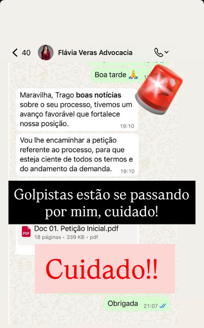 Na conta do Instagram da advogada, um alerta para os seus seguidores não cairem no golpe.