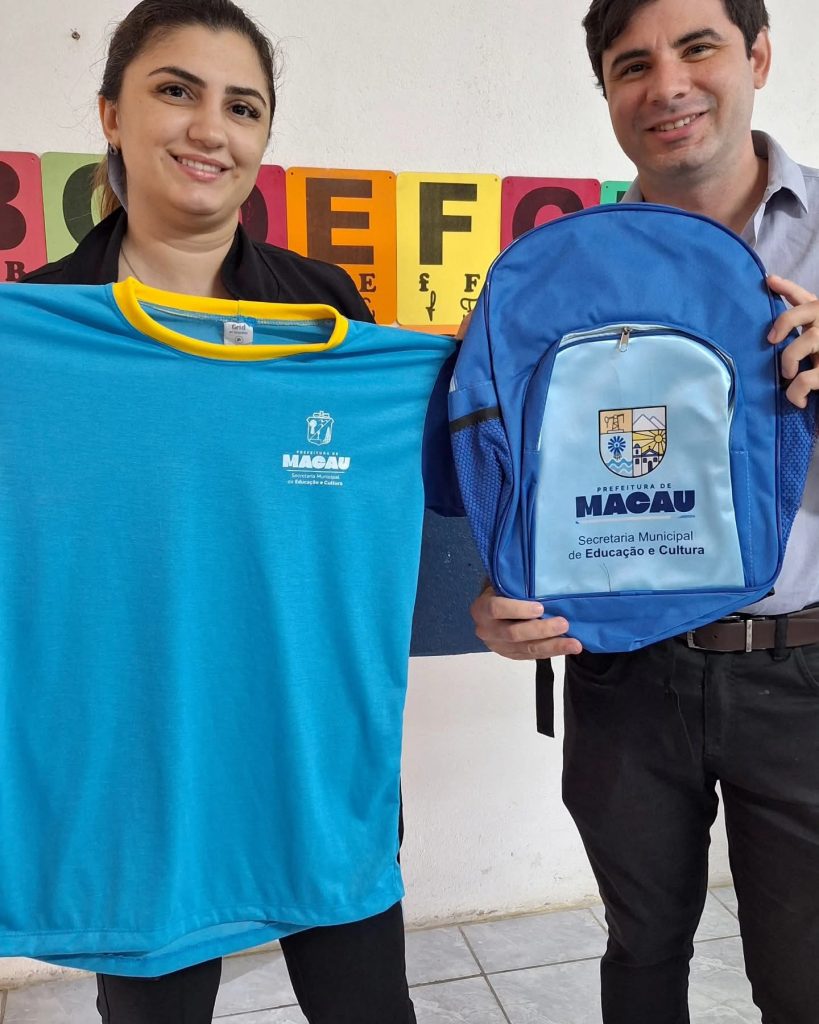 A prefeita de Macau, Flávia Veras, acompanhada da secretária municipal de Educação, Irani Cunha, e de seu esposo, Dr. Clarck Vieira, realizou nesta quarta-feira (04) a entrega de kits escolares e fardamento aos alunos da Escola Municipal Padre João Penha Filho, contemplando os estudantes do 9º ano.