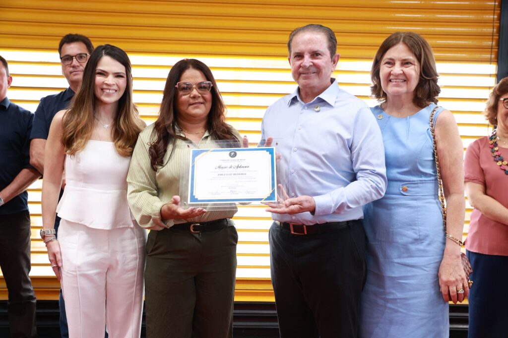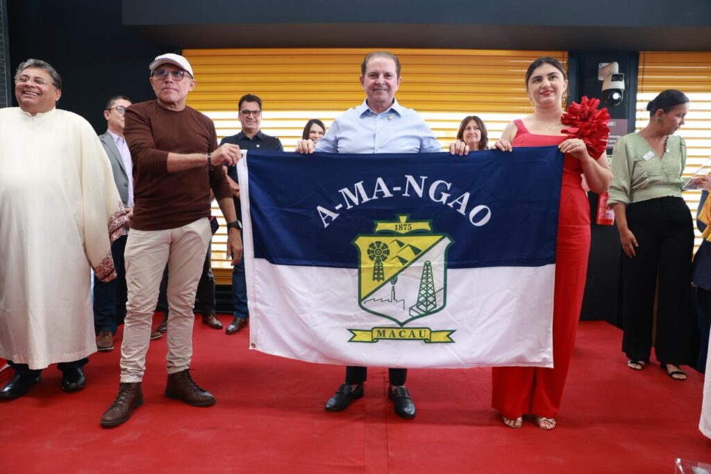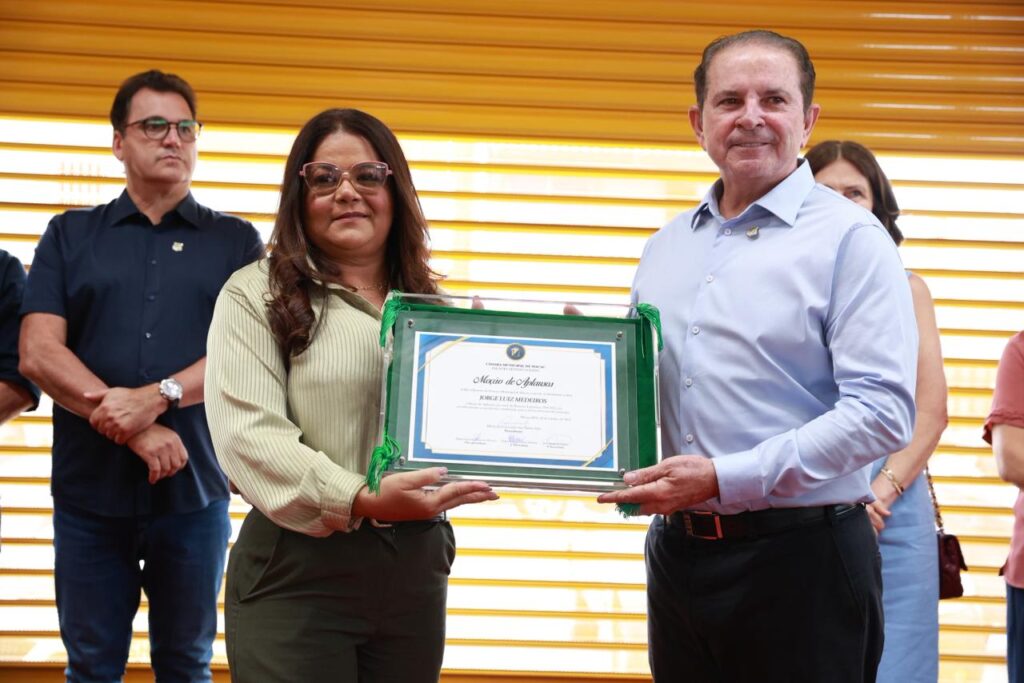 Ainda na manhã marcada por surpresas e emoção, o empresário Jorge Medeiros recebeu uma Moção de Aplausos, concedida pela Mesa Diretora da Câmara Municipal de Macau e entregue pela presidente da Casa, vereadora Ceição Lins. A bênção solene foi presidida pelos padres Antônio Murilo de Paiva e João Batista Nunes Filho.