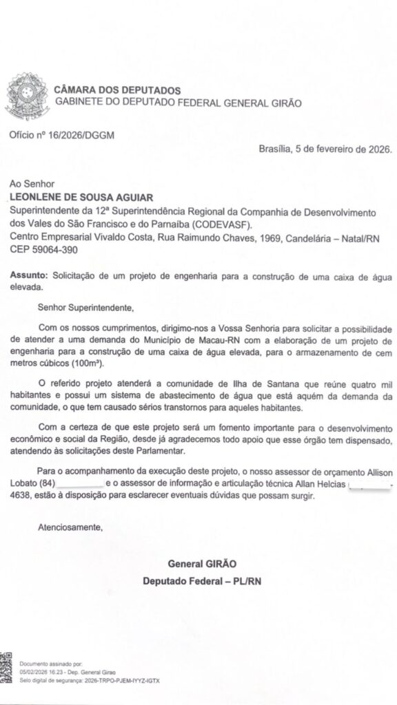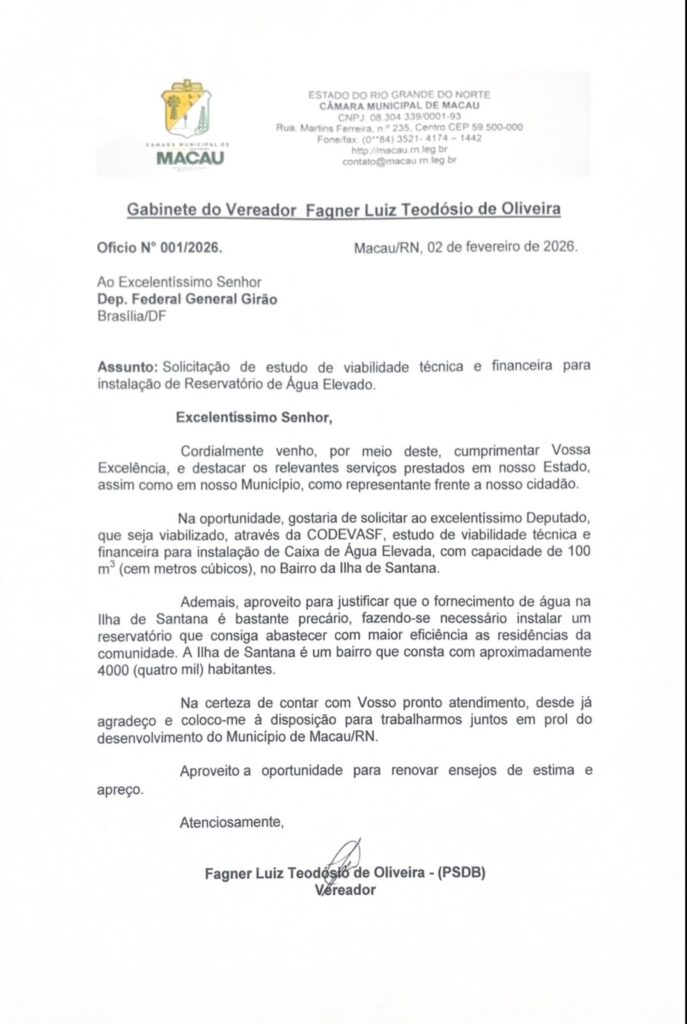 ​Além dos recursos financeiros já garantidos, o vereador protocolou junto ao gabinete do deputado Girão um projeto técnico para sanar um problema histórico de infraestrutura: a construção de uma Caixa D’água Elevada com capacidade para 100 mil litros na Ilha de Santana. A proposta visa garantir a segurança hídrica e a regularidade no abastecimento para os moradores da comunidade, que sofrem com as limitações da rede atual.