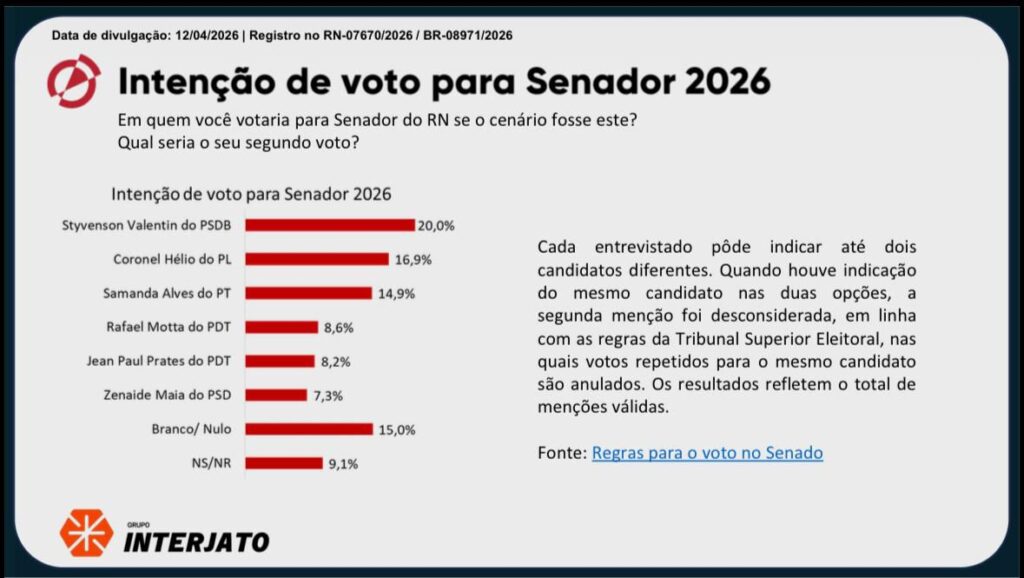 A disputa pelo Senado ainda tem os pedetistas Rafael Motta (8,6%) e Jean Paul Prates (8,2%) como pré-candidatos. Votos brancos, nulos e eleitores indecisos somaram 24,1%.