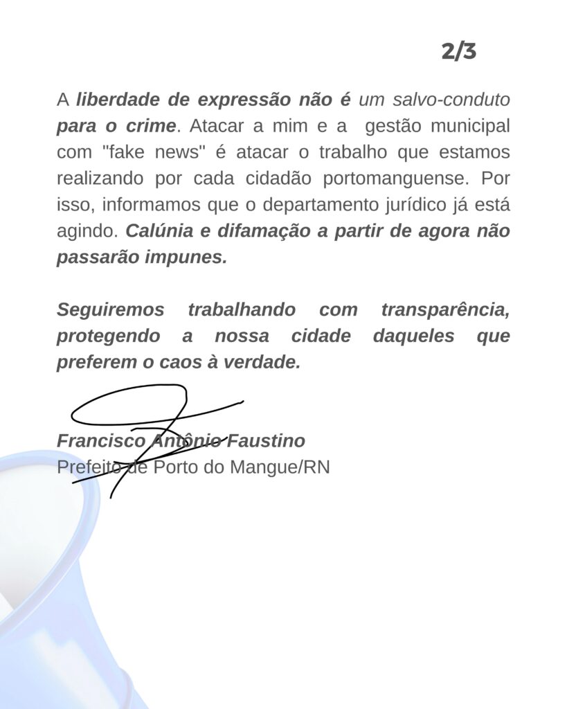 RN Porto do Mangue: Prefeito Faustino emite Nota de Repúdio sobre Fake News 30/01/2026 às 12:10